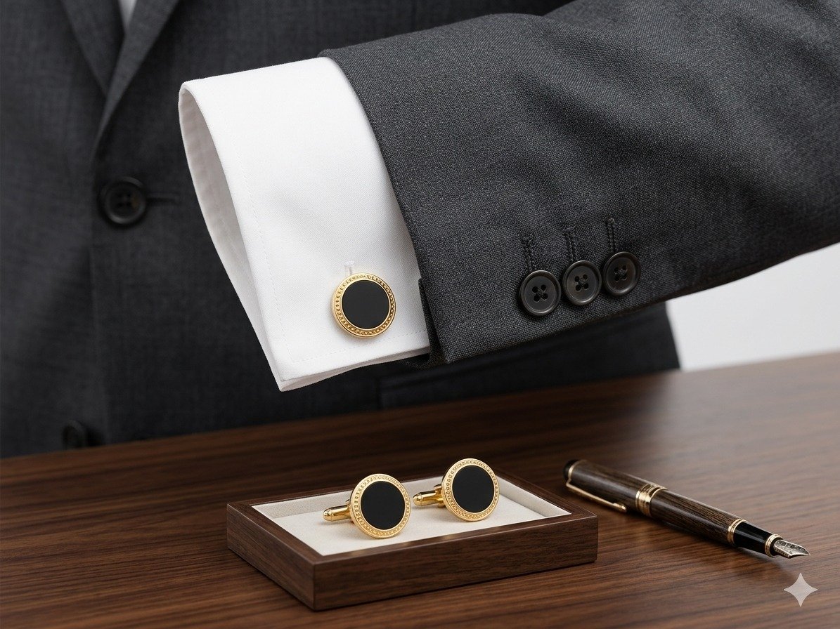 Timeless Contrast: The deep black onyx-style inlay creates a sharp, professional contrast against white French cuffs.