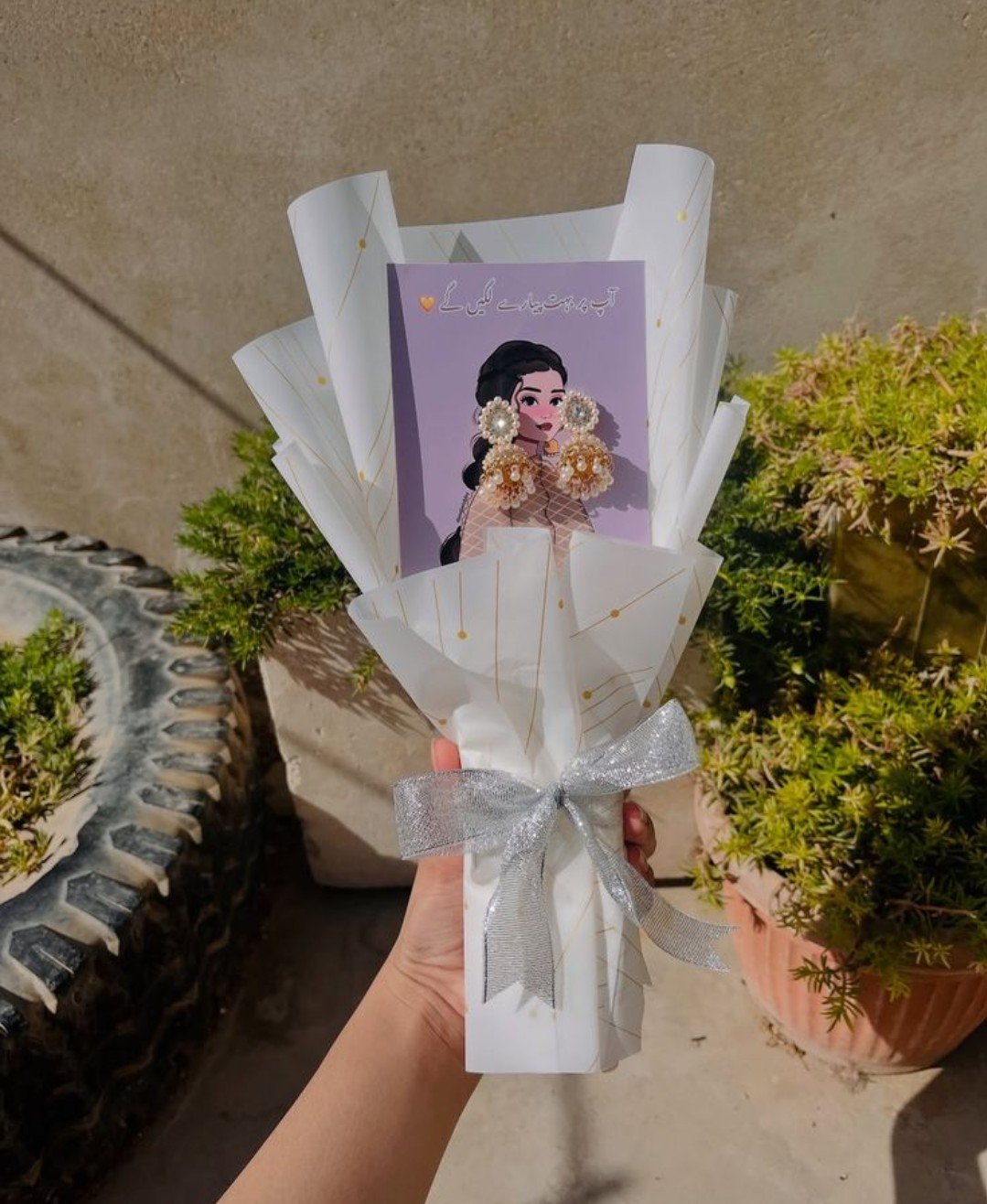 Beautiful handmade gift bouquet with stylish earrings and elegant wrapping, perfect for birthdays, celebrations, and special occasions.