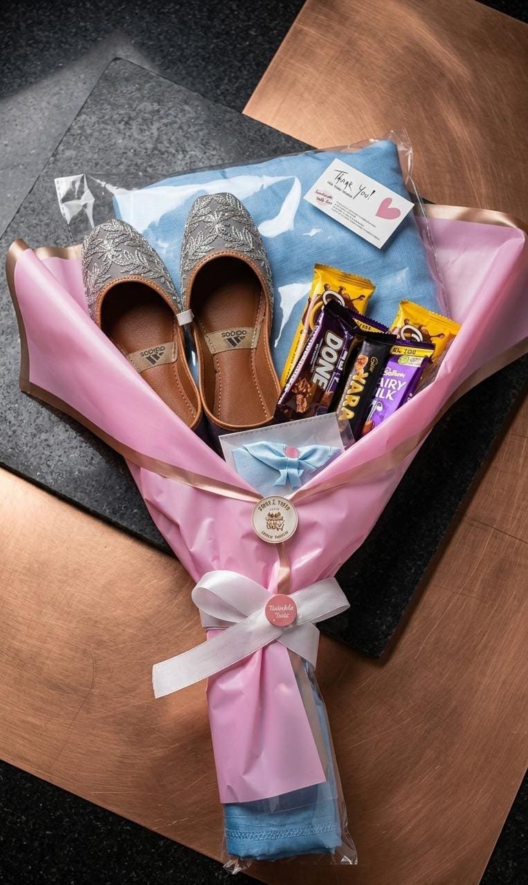 Elegant gift bouquet featuring stylish ladies khussa, chocolates, and beautiful wrapping—perfect for birthdays, surprises, and special occasions.