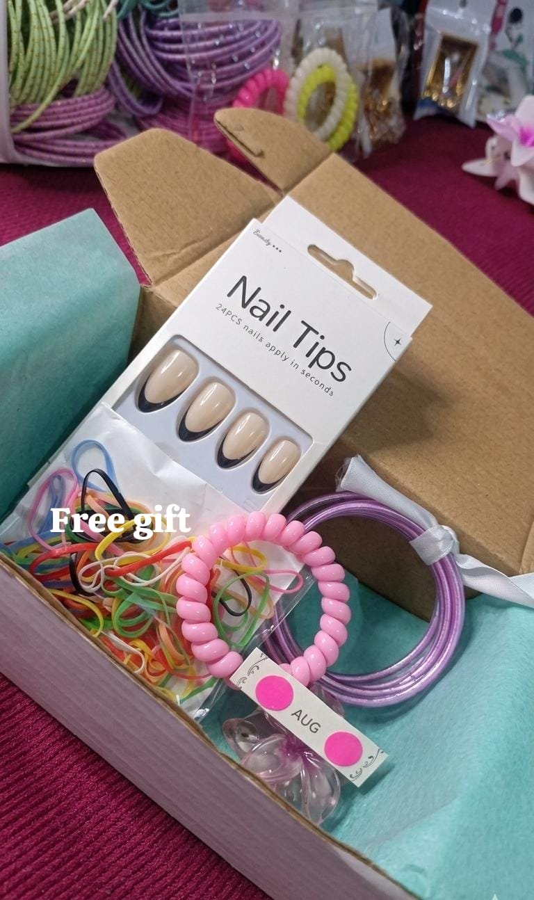 Cute beauty gift box including nail tips and colorful hair accessories. Perfect for girls, small gifts, or surprise hampers.