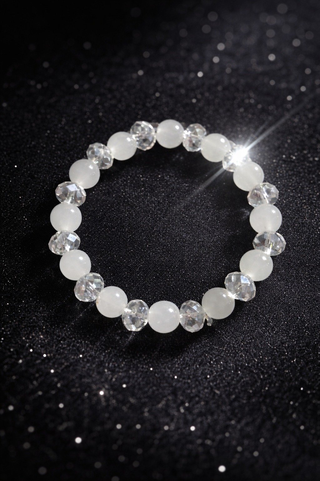 Illuminate your wrist with the Moonlight Sparkle Bracelet, a stunning combination of light-catching textures. This piece features alternating high-shine faceted crystals and smooth, milky-white quartz-style beads, creating a sophisticated “glow” effect that elevates any outfit.