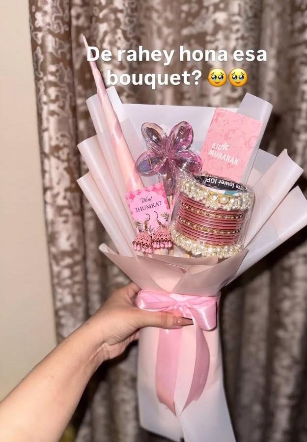 A pink wrapped bouquet with bangles, decorative cards , and a butterfly ornament for Eid.